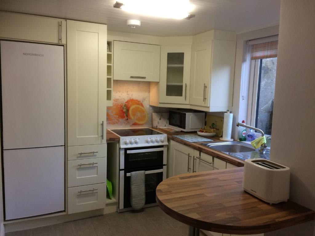 - Woonkamer met tv en open haard en prima keuken in het huis.